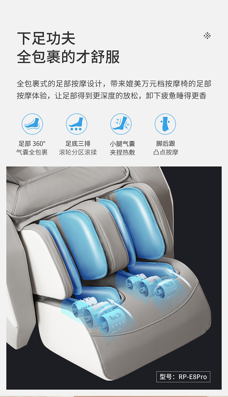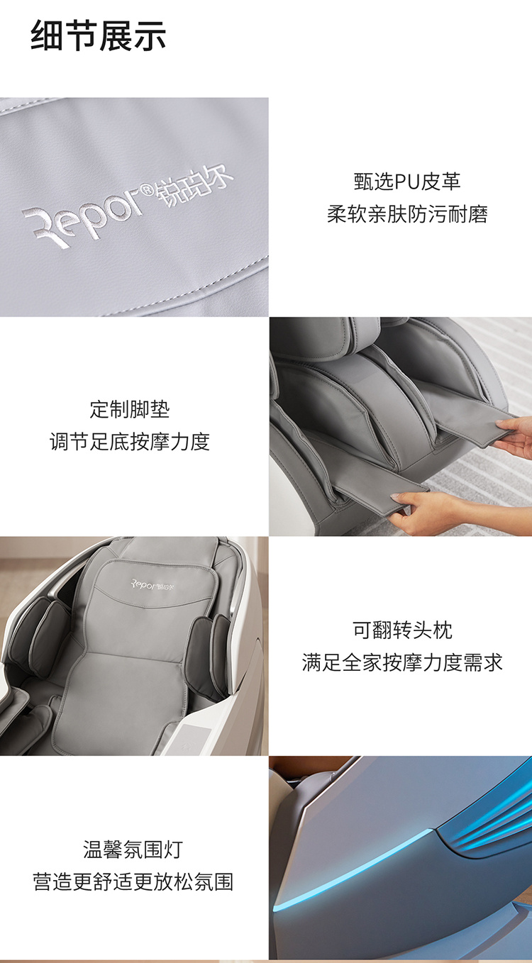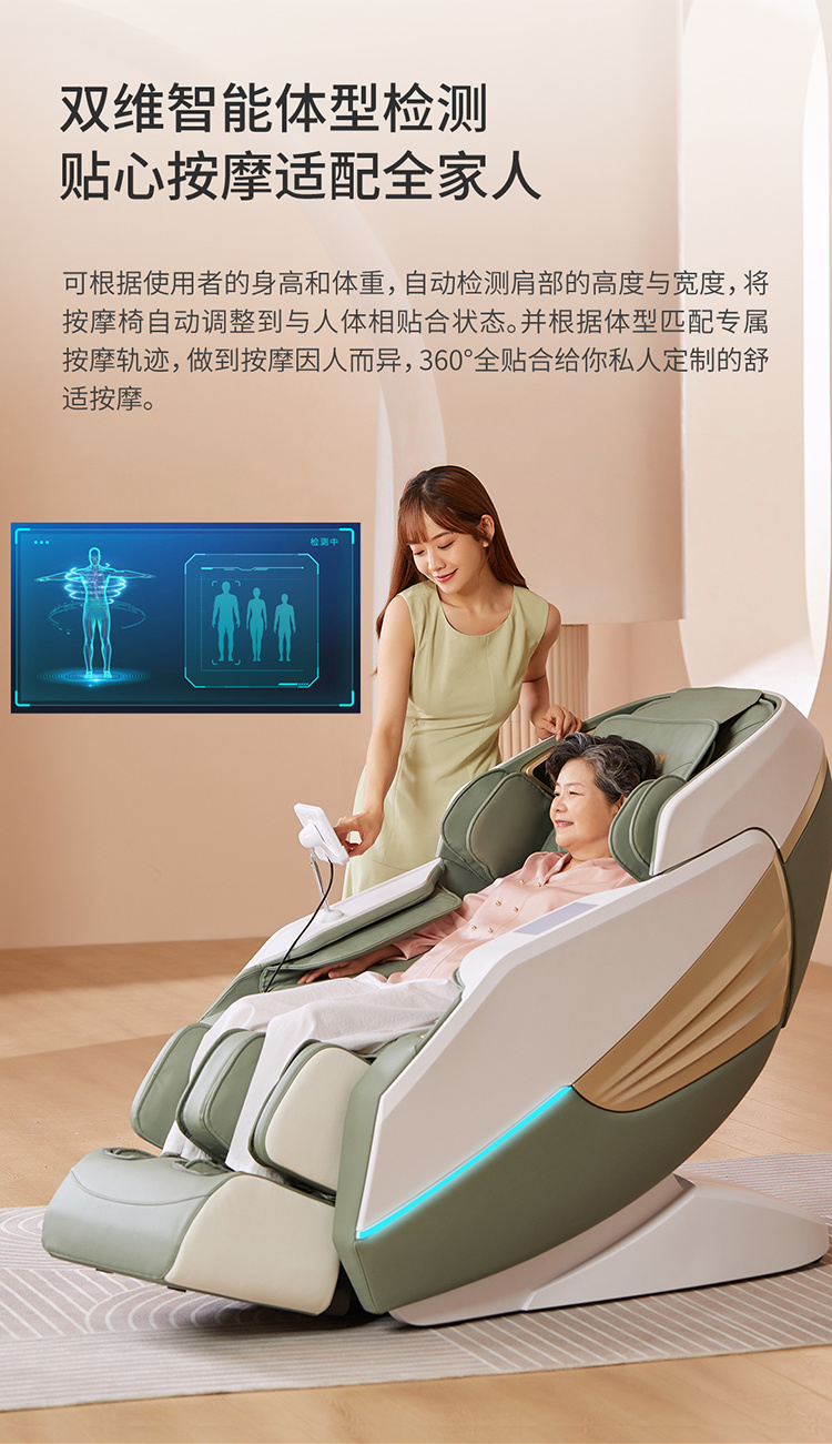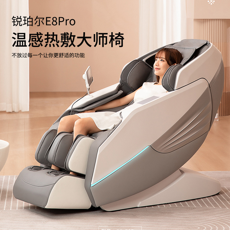 銳珀爾集十余年技術(shù)積累,傾力打造銳珀爾新款按摩椅4D穴感總裁椅,擁有全新的AI智能語音,小腿溫?zé)崛啻?、腳底震動、4D機械手等全新功能創(chuàng)新,智能健康體測,可以檢測血氧、心率、微循環(huán)等數(shù)值,通過大數(shù)據(jù)分析,給您提供合理的改善方法,時刻關(guān)注您的健康狀況;超大液晶智能觸控,專為總裁量身打造的特色按摩程序,20分鐘快速補充精力,多種按摩程序,滿足全家人的需求。
