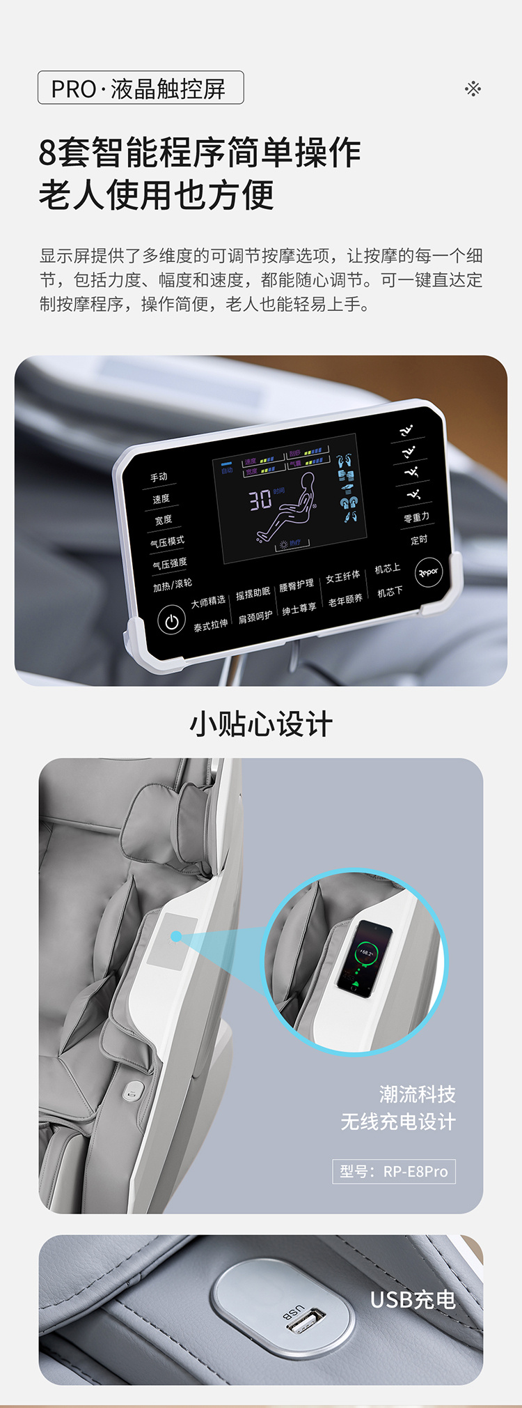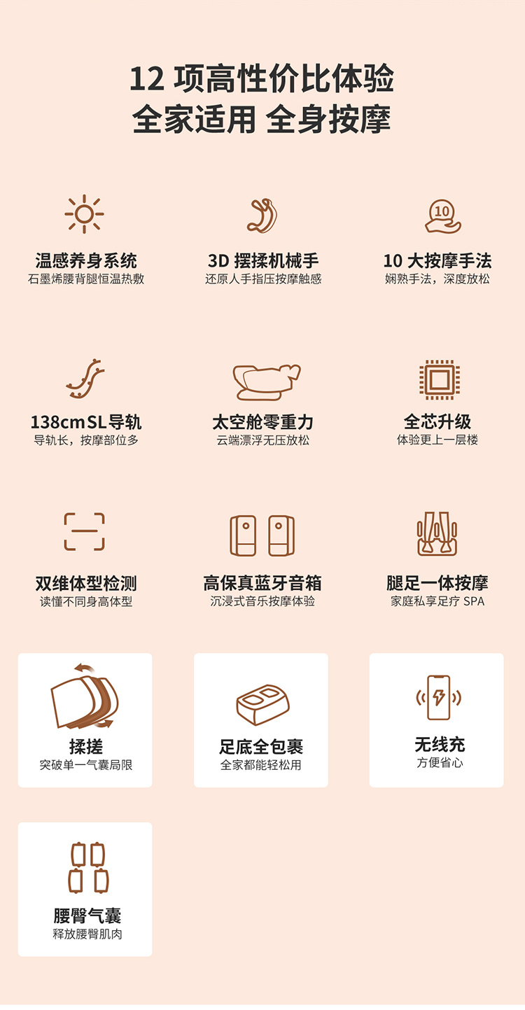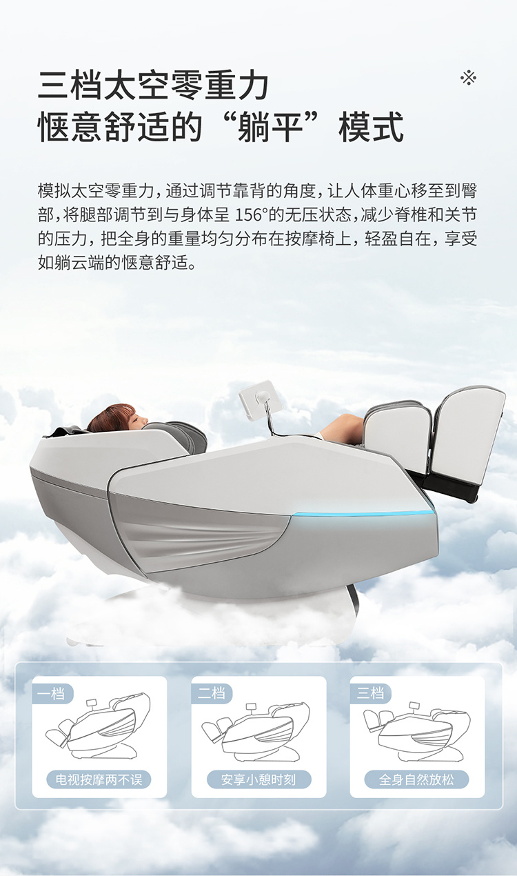 銳珀爾集十余年技術(shù)積累,傾力打造銳珀爾新款按摩椅4D穴感總裁椅,擁有全新的AI智能語音,小腿溫?zé)崛啻?、腳底震動、4D機械手等全新功能創(chuàng)新,智能健康體測,可以檢測血氧、心率、微循環(huán)等數(shù)值,通過大數(shù)據(jù)分析,給您提供合理的改善方法,時刻關(guān)注您的健康狀況;超大液晶智能觸控,專為總裁量身打造的特色按摩程序,20分鐘快速補充精力,多種按摩程序,滿足全家人的需求。