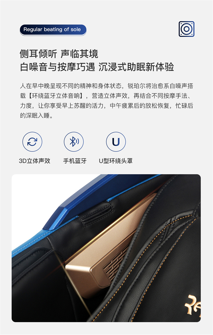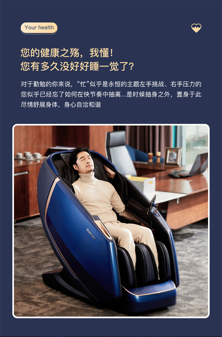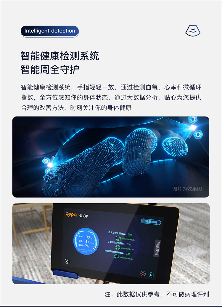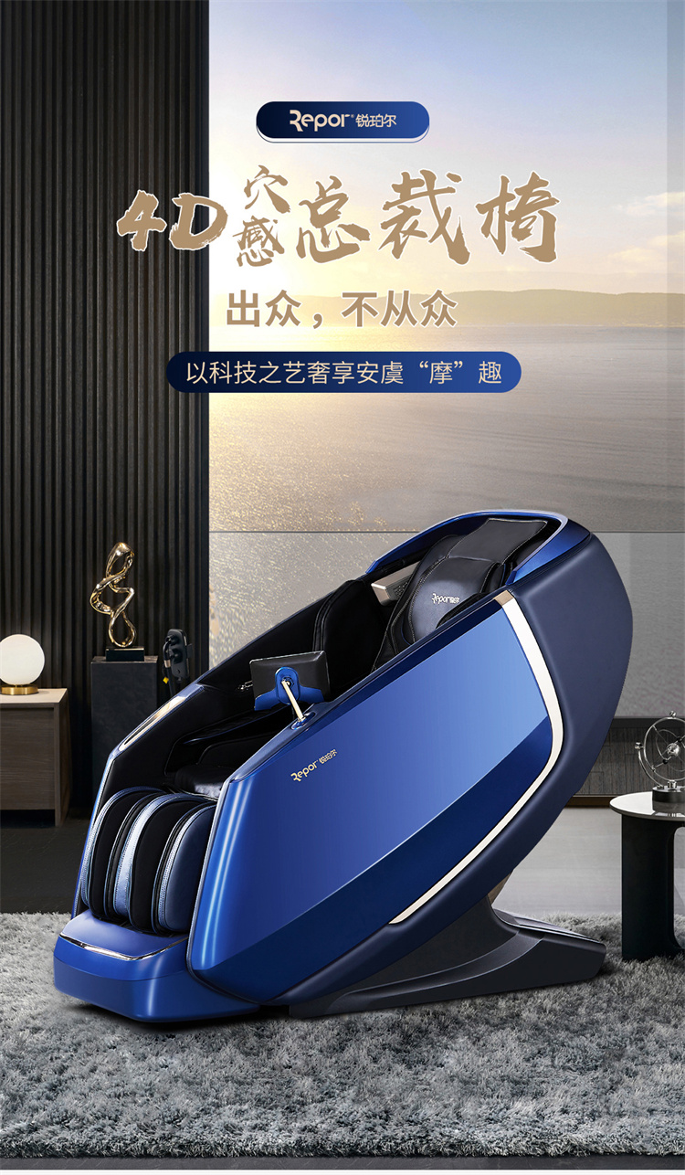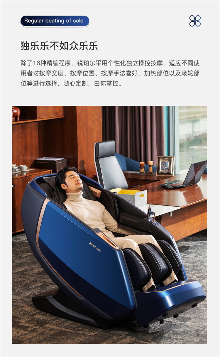 銳珀爾集十余年技術(shù)積累,傾力打造銳珀爾新款總裁4D穴感總裁椅S500,擁有全新的AI智能語音,小腿溫熱揉搓、腳底震動、4D機械手等全新功能創(chuàng)新,智能健康體測,可以檢測血氧、心率、微循環(huán)等數(shù)值,通過大數(shù)據(jù)分析,給您提供合理的改善方法,時刻關(guān)注您的健康狀況;超大液晶智能觸控,專為總裁量身打造的特色按摩程序,20分鐘快速補充精力,多種按摩程序,滿足全家人的需求。