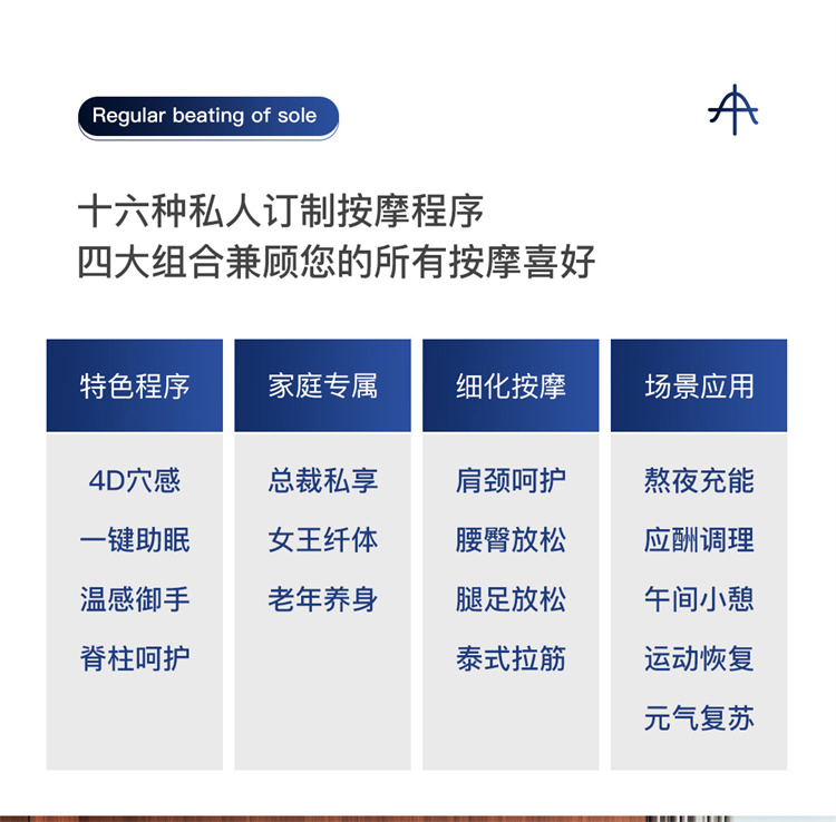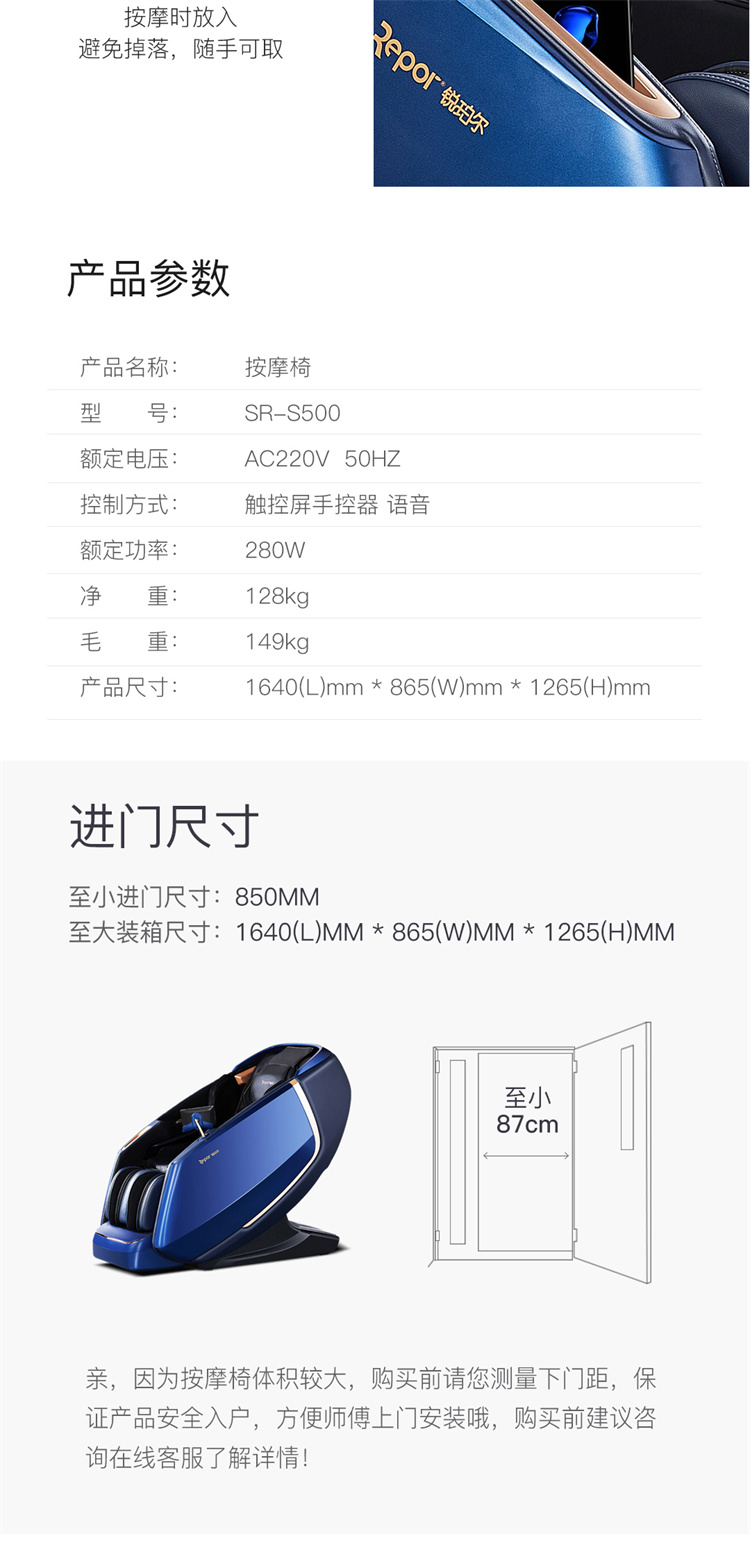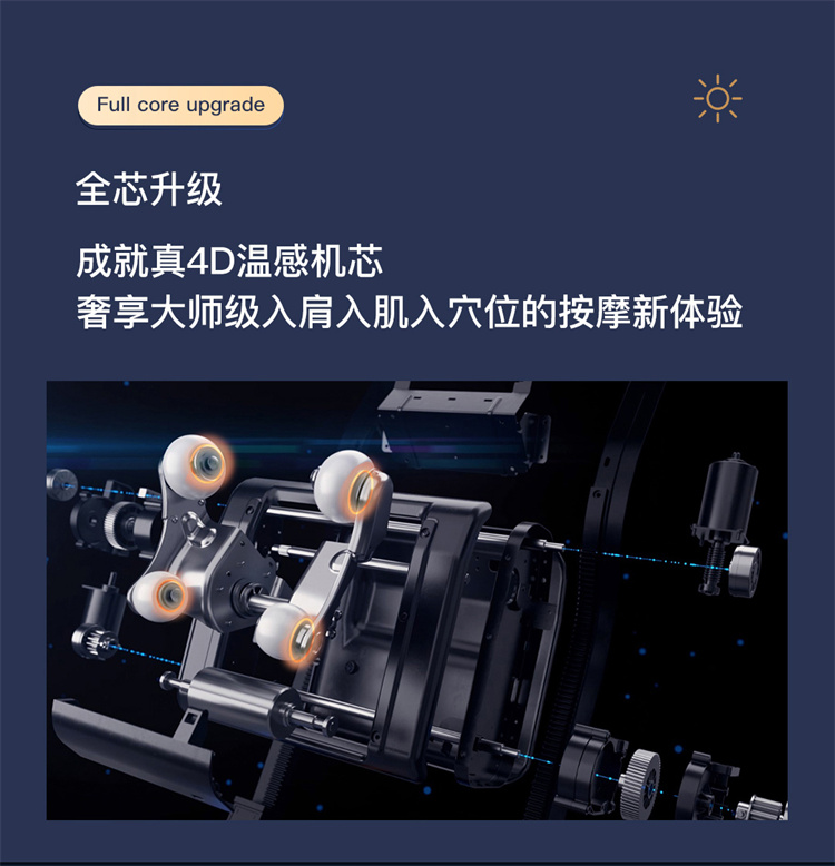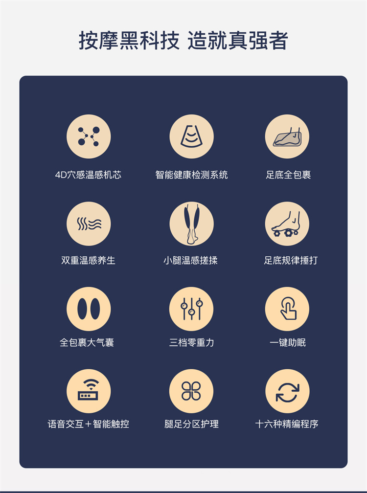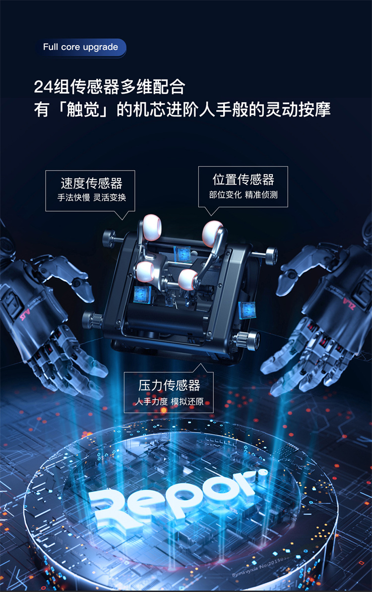 銳珀爾集十余年技術(shù)積累,傾力打造銳珀爾新款總裁4D穴感總裁椅S500,擁有全新的AI智能語音,小腿溫熱揉搓、腳底震動、4D機械手等全新功能創(chuàng)新,智能健康體測,可以檢測血氧、心率、微循環(huán)等數(shù)值,通過大數(shù)據(jù)分析,給您提供合理的改善方法,時刻關(guān)注您的健康狀況;超大液晶智能觸控,專為總裁量身打造的特色按摩程序,20分鐘快速補充精力,多種按摩程序,滿足全家人的需求。