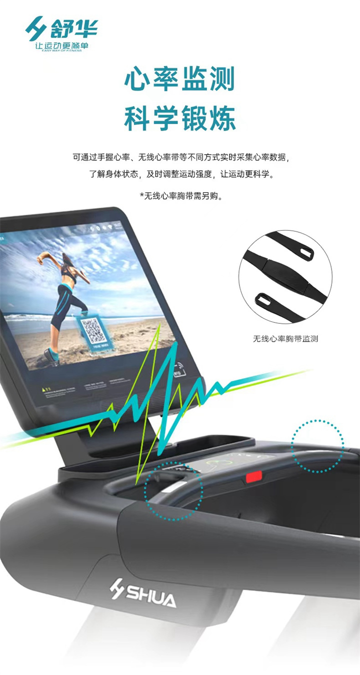 舒華商用跑步機(jī)SH-T8919采用t2.2mm黑鉆紋(可選配:t2.4免維護(hù)跑帶)的跑帶,,選用手握心率測(cè)試 自帶心率帶及增加心率控速(HRC)程序模塊、接觸式心率感應(yīng)測(cè)量心跳等數(shù)據(jù),跑步面積達(dá)580×1570mm,可承受180kg的使用者使用。